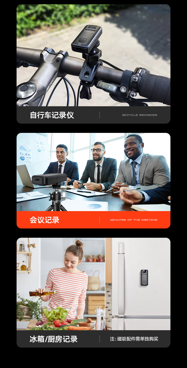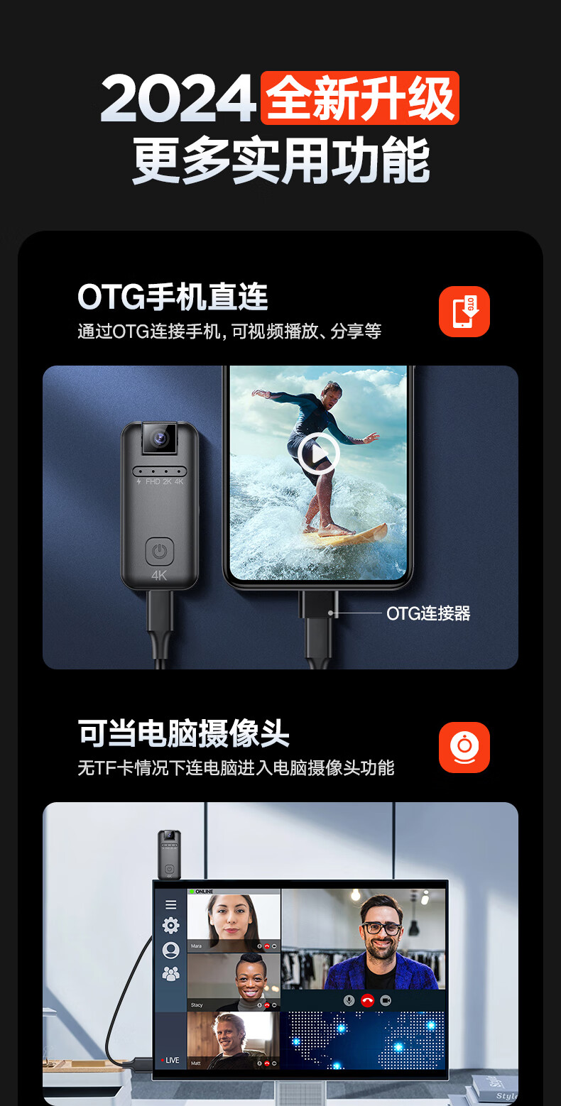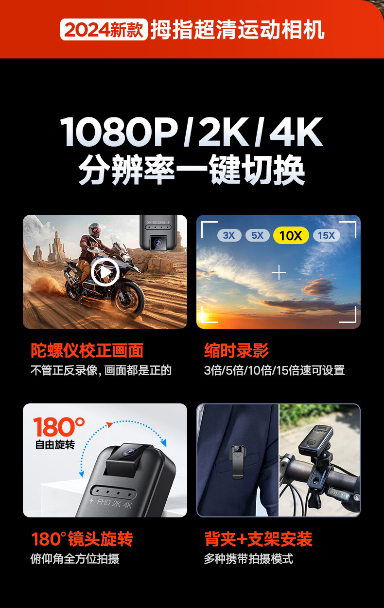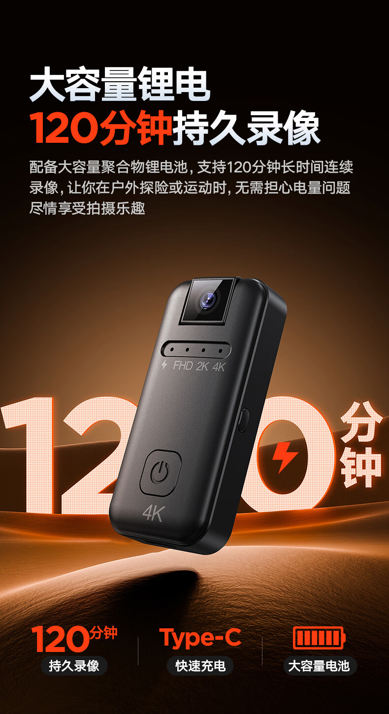 苏维高清4K运动摄像机摄像头随身记录仪便携式骑行摩托车户外录像机穿戴领夹式胸前口袋取证录像神器 4K高清摄像机 128GB内存版